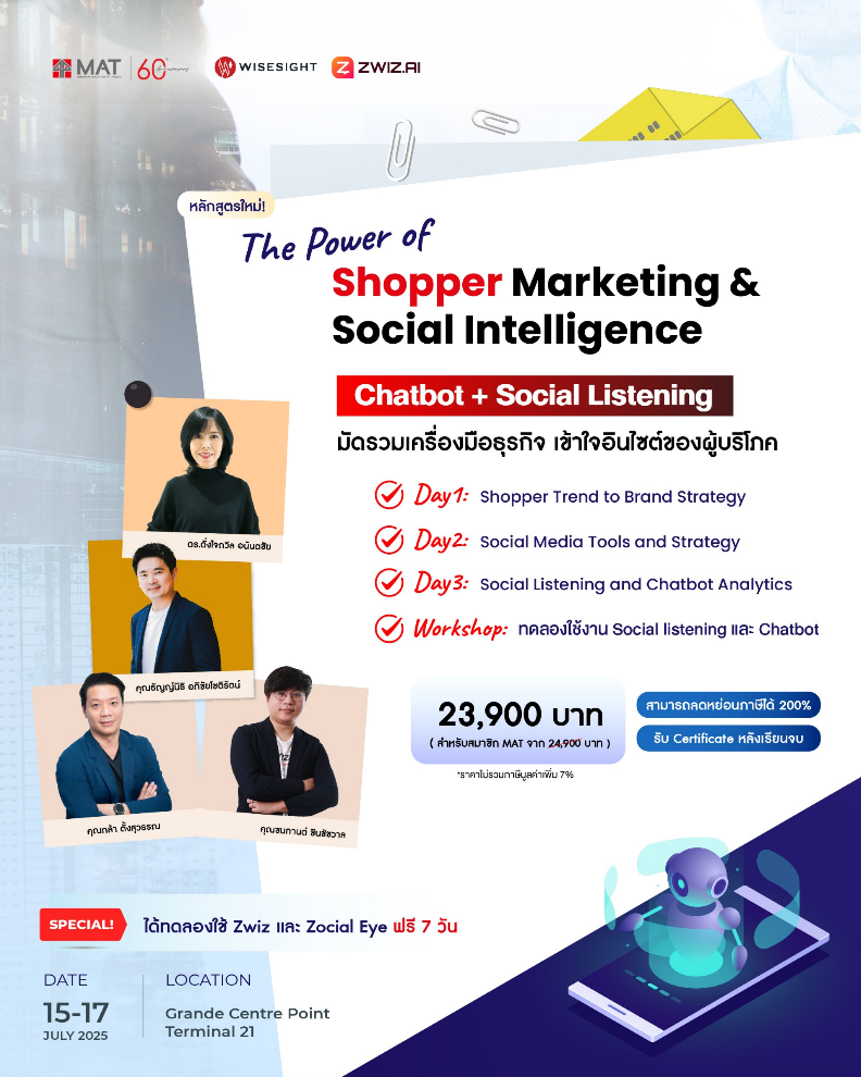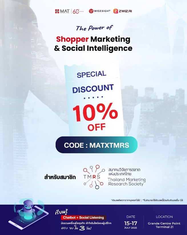 Our association partner, the Marketing Association of Thailand, is organizing The Power Of Shopper Marekting & Social Intelligence. TMRS members are entitled to a 10% discount on event registration. Below are the details of the Shopper Training Event: